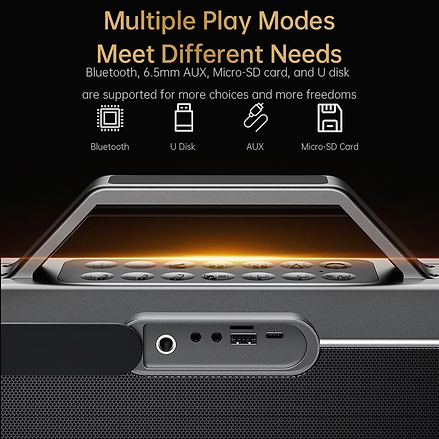 بفضل بطارية 18 000 مللي أمبير يوفر التشغيل لمدة حتى 5 ساعات، ويدعم Bluetooth 5.3 لاتصال سريع وثابت، مع خيارات تشغيل متعددة تشمل AUX، USB، TF، ميكروفون لاسلكي UHF وميكروفون سلكي 6.35 مم. تضيف إضاءة RGB ديناميكية أجواء احتفالية مذهلة، بينما يسهّل المقبض المدمج حمله ونقله في أي مكان.