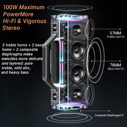 Experience powerful sound and stunning lighting with the Awei KT8 Bluetooth Speaker — engineered for parties, events, and professional use. Delivering a massive 120 W output through dual 4-inch and 2-inch drivers with dual bass-vibrating plates, it produces deep lows and crystal-clear highs for immersive music anywhere.
