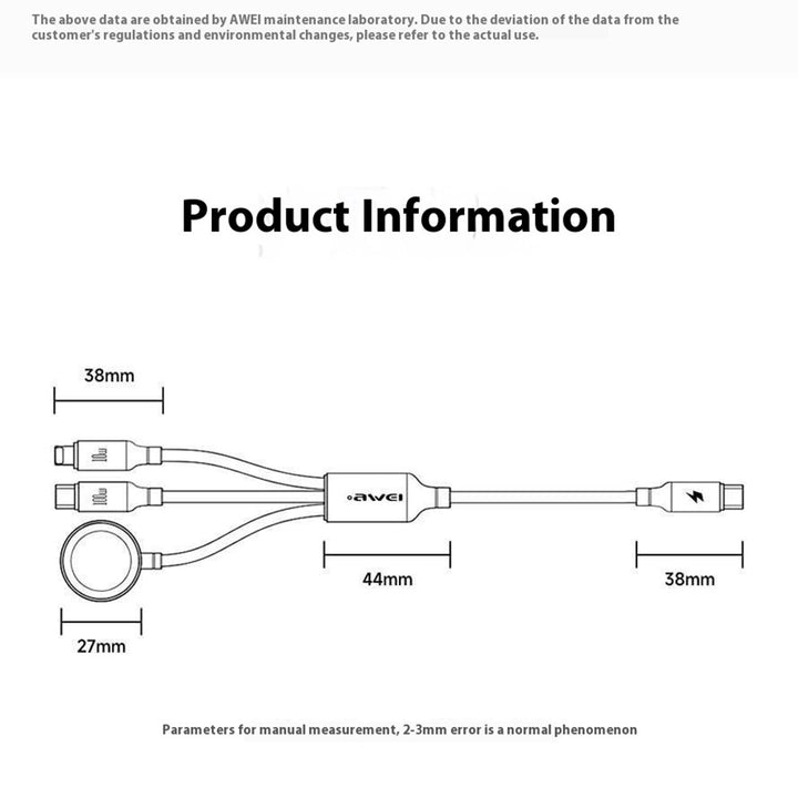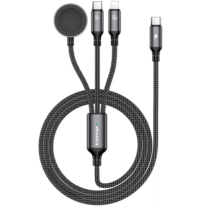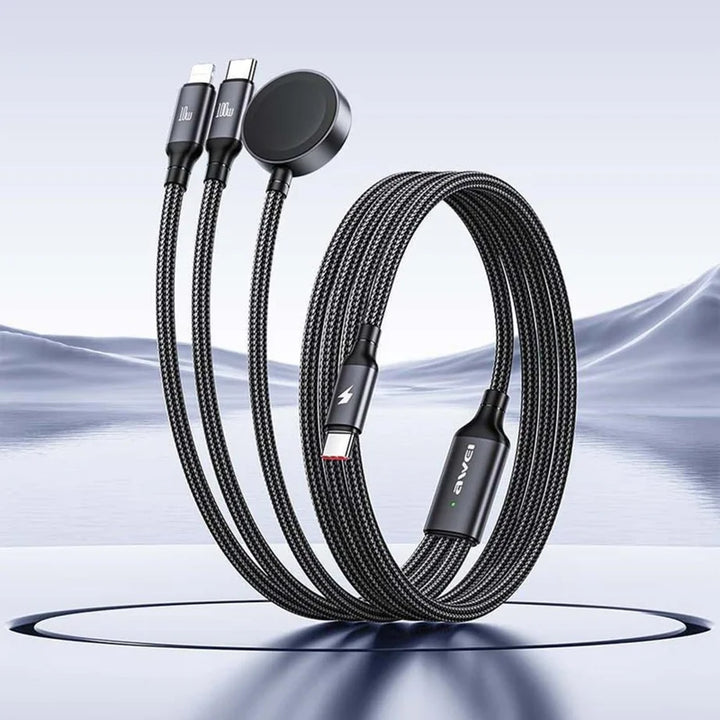 Charge all your essential devices with one premium cable — the Awei W23 3-in-1 Charging Cable. Designed for modern convenience, it combines Type-C to Type-C, Lightning, and wireless Apple Watch charging in a single braided cable. Delivering up to 100W PD fast charging, it powers laptops, tablets, and smartphones efficiently, while the integrated 10W wireless pad keeps your Apple Watch charged effortlessly.