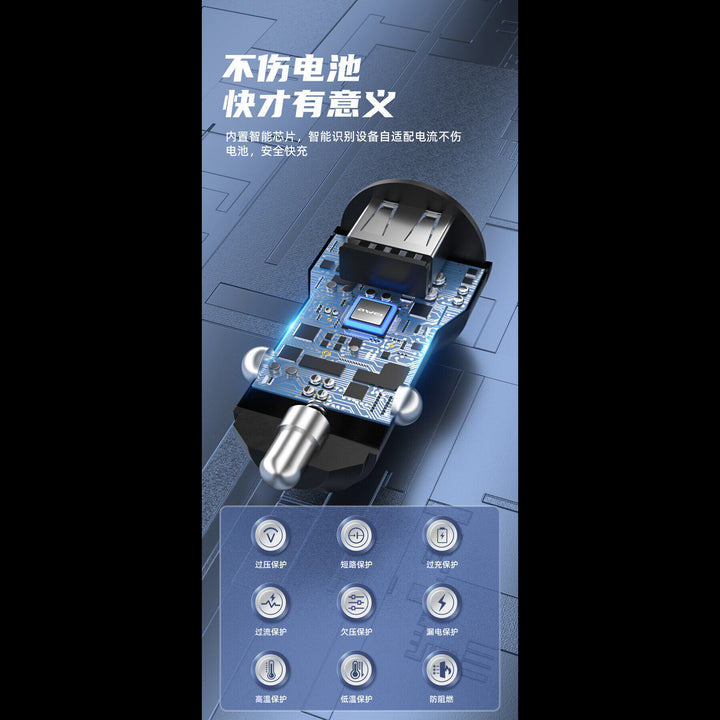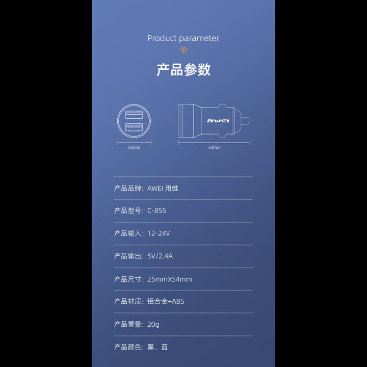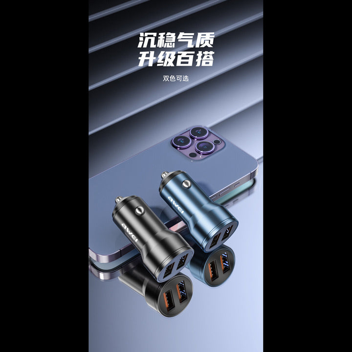 Experience powerful and compact charging with the Awei C-855 Car Charger — engineered for speed, safety, and style. Equipped with dual ports (Type-A + Type-C, QC3.0), this charger delivers up to 30W fast charging power to multiple devices simultaneously. Crafted from premium zinc alloy, it provides superior heat dissipation and a sleek metallic finish that complements any car interior. Supporting all major fast-charging protocols including QC2.0, QC3.0, SCP, FCP, AFC, and MTK PE, the C-855 ensures safe and stable power delivery for smartphones, tablets, and other gadgets. Designed for 12V–24V vehicles, it’s perfect for both cars and trucks.