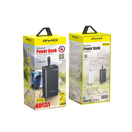 باور بانك Awei P171K 60000mAh مصمم لمن يحتاج إلى طاقة ضخمة أثناء التنقل. مزود بمخرجين Type-C يدعمان شحناً سريعاً بقوة تصل إلى 65W، مما يتيح شحن اللابتوبات، التابلت، والهواتف الذكية في نفس الوقت. شاشة LED تعرض حالة البطارية لحظة بلحظة بدقة عالية.