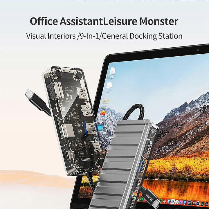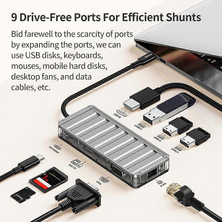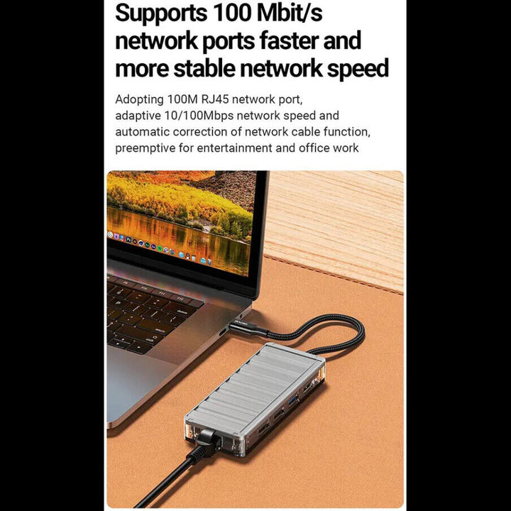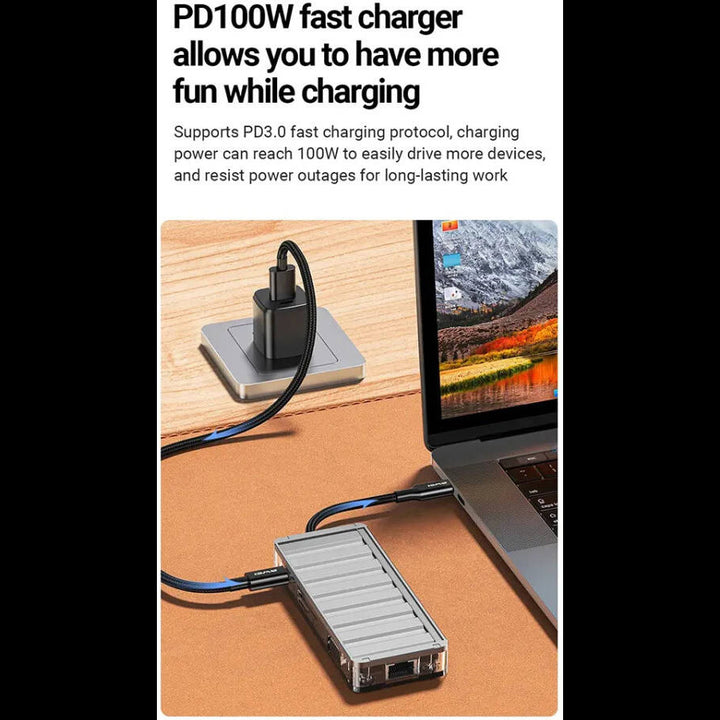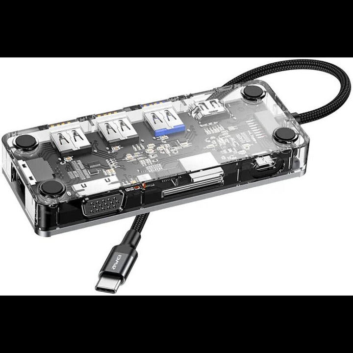 Upgrade your workstation with the Awei HUB-3 — a 9-in-1 semi-transparent docking station built for performance, style, and versatility. Equipped with HDMI (4K@30Hz) and VGA (1080p) outputs, it supports multi-display setups for enhanced productivity. Enjoy 100W PD 3.0 fast charging to keep your laptop and accessories powered, along with USB 3.0, USB 2.0, RJ45 Ethernet, and SD/TF card readers for complete connectivity. The sleek semi-transparent design and durable aluminum alloy body make it ideal for professionals, gamers, and creators.
