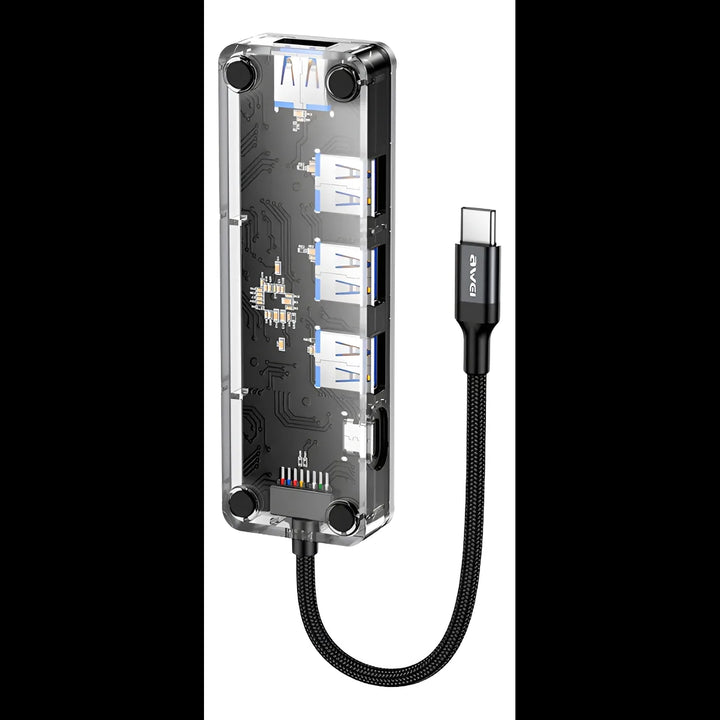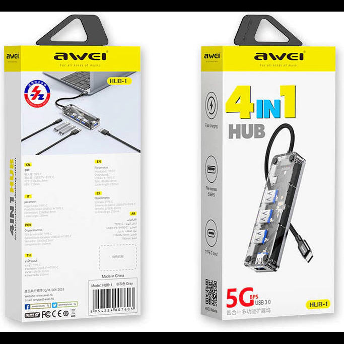 The Awei HUB-1 is a sleek and durable 4-in-1 Type-C docking station designed for modern laptops and tablets. Featuring high-speed USB 3.0 ports with transfer rates up to 5Gbps, it ensures seamless data transmission and peripheral connectivity. Built with premium materials for durability and heat resistance, this compact hub provides a convenient plug-and-play solution for expanding your device’s connectivity — perfect for work, study, or travel.