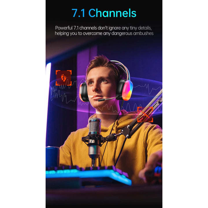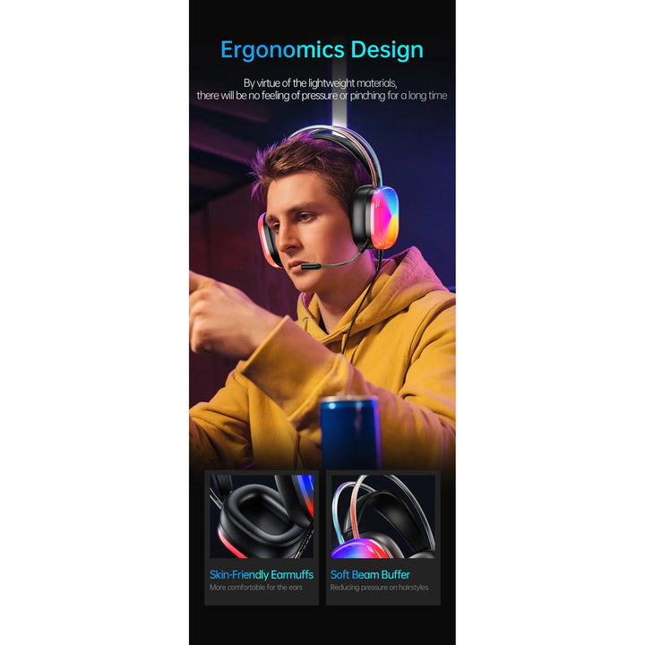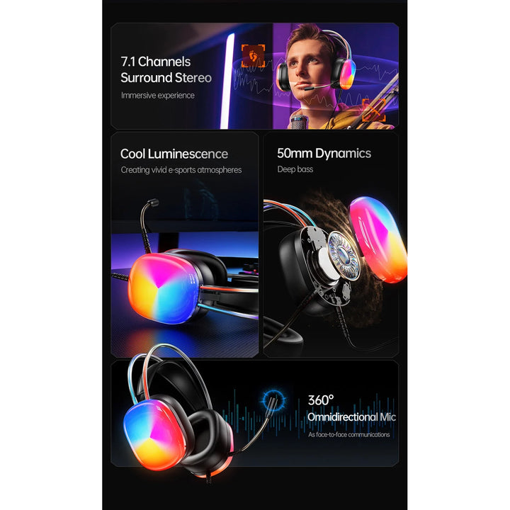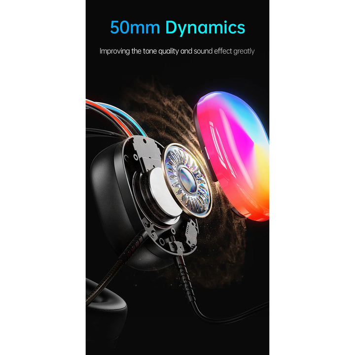 تتميز بوحدات تشغيل 50mm تمنحك صوت جهير قوي وتفاصيل دقيقة في الترددات العالية، مع إضاءة RGB المتغيرة بـ7 ألوان تضيف لمسة احترافية إلى إعدادك. وسادات الأذن المريحة تتيح لك اللعب لساعات طويلة دون تعب، بينما يضمن منفذ USB Type-A توافقًا مثاليًا مع أجهزة الكمبيوتر واللابتوب.