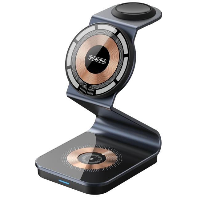 Charge all your devices in one sleek stand. This 3-in-1 magnetic wireless charging dock supports fast 15W output for smartphones, plus dedicated pads for earbuds and smartwatches. Designed with tempered glass and aluminum alloy, it delivers both power and style to your desk or bedside.