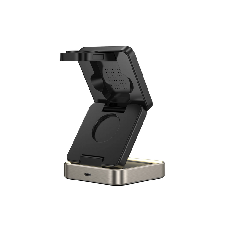 محطة الشحن المدمجة دي بتشحن الآيفون، وساعة Apple Watch، وسماعات AirPods في نفس الوقت، بتصميم أنيق قابل للطي يناسب المكتب أو الكومود بجانب السرير.