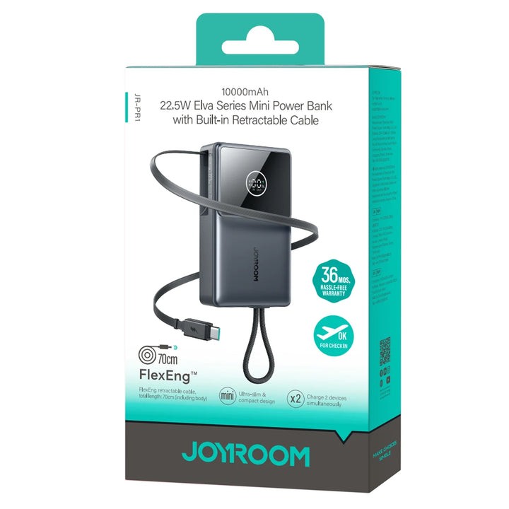 The Joyroom Elva Series 10000mAh Mini Power Bank is designed for convenience, speed, and portability. Equipped with 22.5W fast charging and a built-in 70cm retractable cable, it ensures you stay powered up without the hassle of carrying extra cords.
