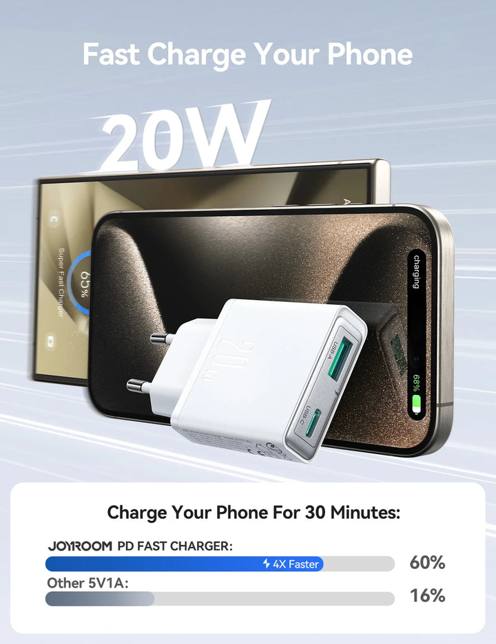 Experience next-level charging efficiency with the Joyroom 20W PD Fast Charger — engineered for speed, safety, and style. Its ultra-slim design is 64% thinner than traditional chargers, making it perfect for travel and everyday use.