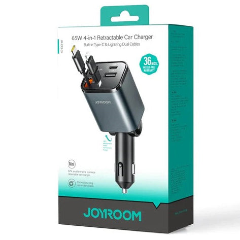 Power up your devices on the go with the Joyroom 65W 4-in-1 Retractable Car Charger. Designed with convenience and efficiency in mind, this compact charger comes with built-in Type-C and Lightning cables, eliminating the need for extra cords. With a total output of 65W fast charging, it ensures quick and reliable power delivery for smartphones, tablets, and more.
