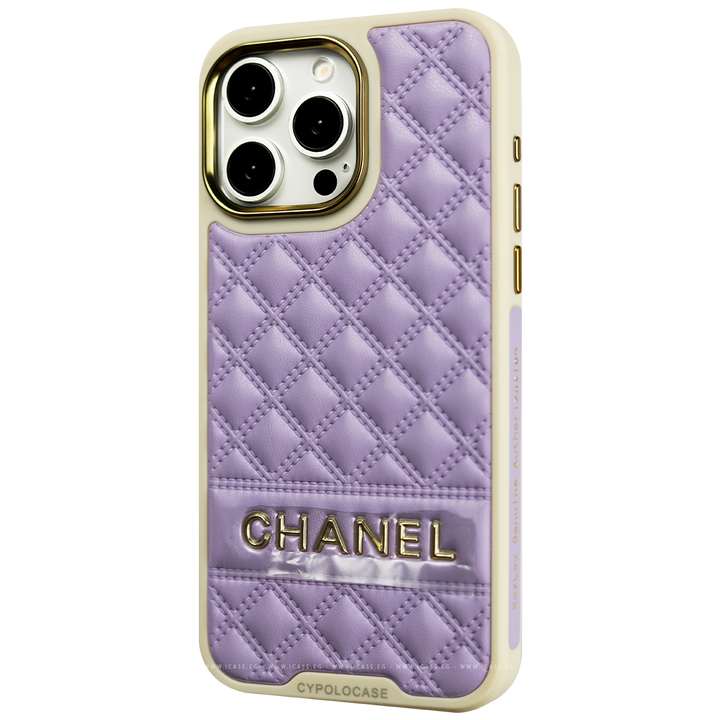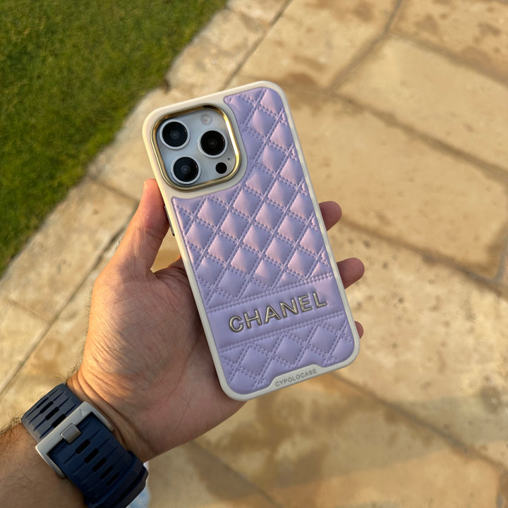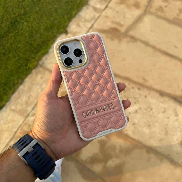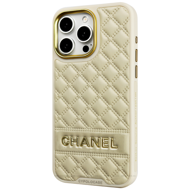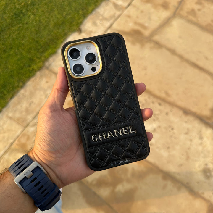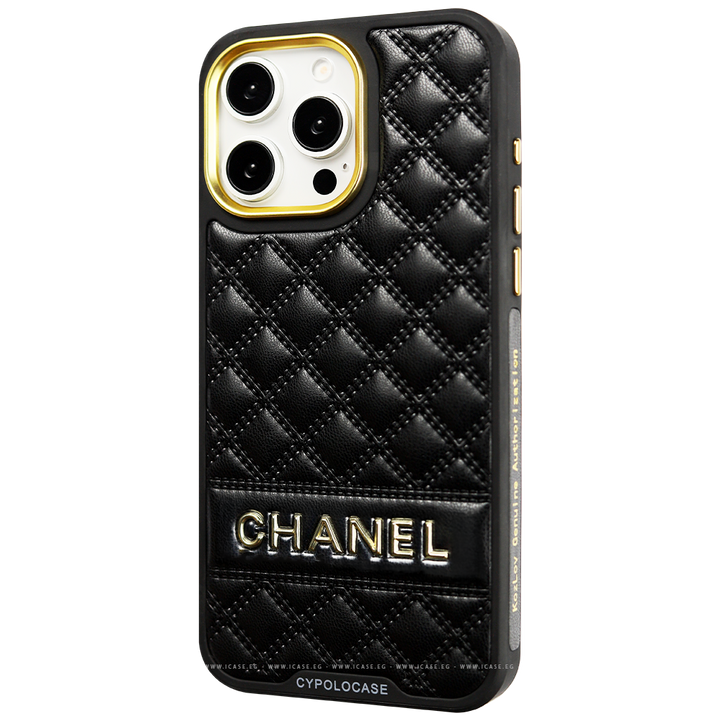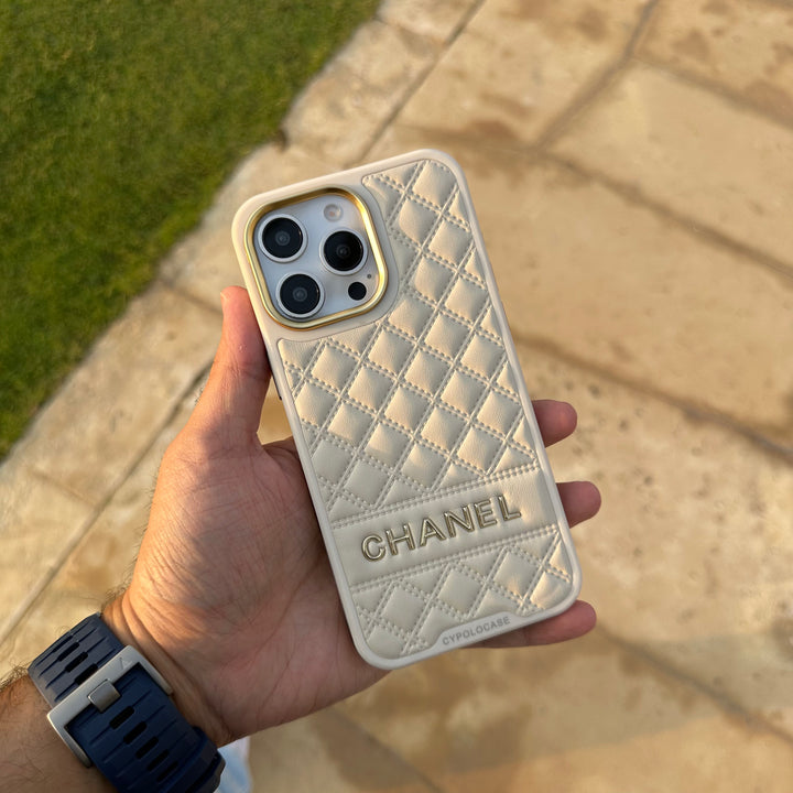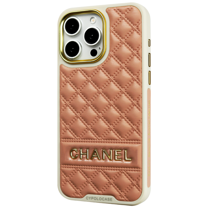 Bring elegance to your everyday style with this premium quilted iPhone case. Designed with a soft-touch leather finish and luxury diamond-stitched pattern, it features a bold metallic logo and a gold-trimmed camera ring for a sophisticated look. The raised edges offer extra protection while keeping your phone fashion-forward.
