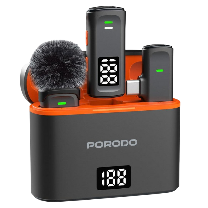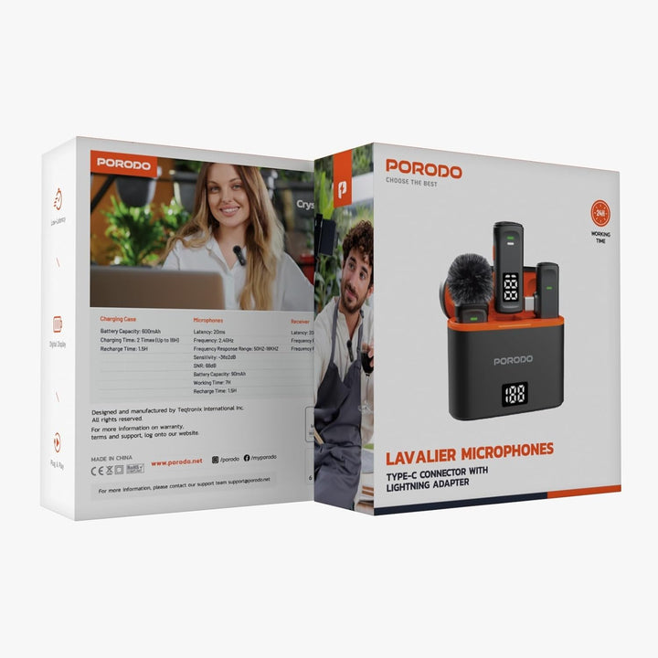 The Porodo Lavalier Microphones deliver professional-grade audio in a compact, wireless design. Featuring a dual-mic system, this set is perfect for interviews, content creation, and live streaming. The included charging case with LED battery display ensures you stay powered up all day with an impressive 24 hours of working time. With Type-C and Lightning adapters, it's compatible with a wide range of smartphones and devices.