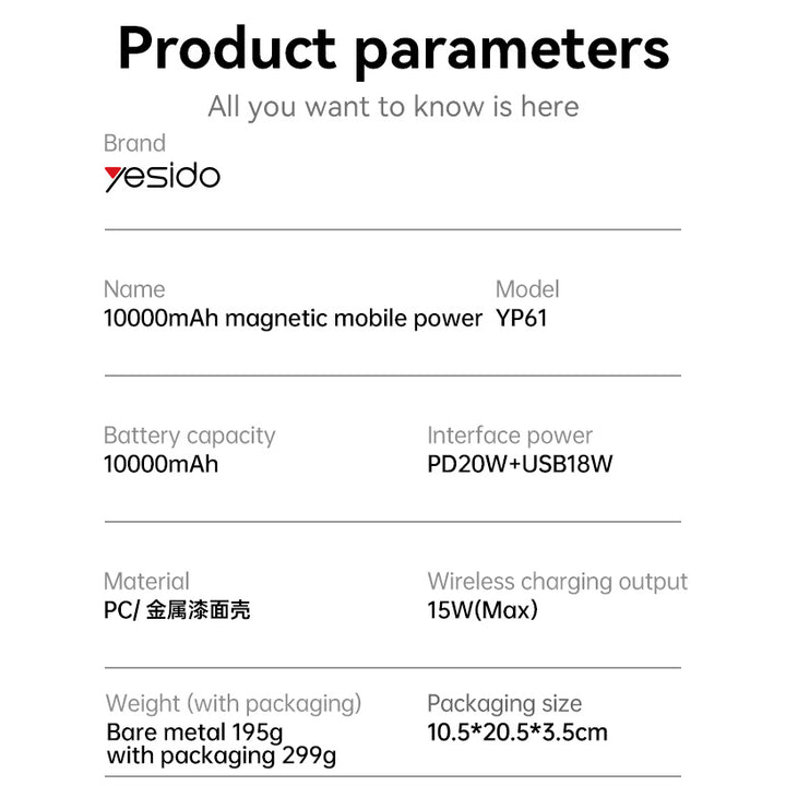 خليك مشحون في أي مكان مع Yesido YP61 10000mAh Magnetic Wireless Power Bank. مصمم للراحة والكفاءة، بيجمع بين السعة العالية وتقنية الشحن اللاسلكي المتطورة، وبيضمن إن أجهزتك دايمًا جاهزة للاستخدام. تصميمه العصري النحيف مع المغناطيس القوي بيخليه مثالي للآيفون وأجهزة MagSafe المتوافقة.