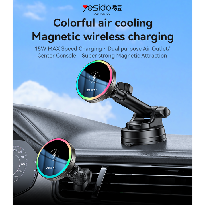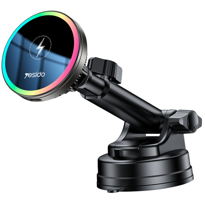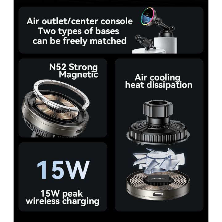 استمتع بشحن سريع وثابت وبارد مع Yesido C31 15W Fan Cooling Wireless Car Charger. مزود بمروحة تبريد مدمجة تمنع ارتفاع درجة الحرارة أثناء الشحن، لتحافظ على هاتفك آمنًا ومشحونًا بكفاءة. تأتي اللوحة المغناطيسية الزجاجية بتثبيت قوي للهاتف، بينما توفر تقنية الشحن اللاسلكي السريع بقدرة 15W أداءً ممتازًا لجميع الأجهزة المتوافقة مع Qi مثل سلسلة iPhone 12–16. يتميز بذراع ممتدة حتى 22 سم مع دوران بزاوية 360° لحرية ضبط مثالية سواء على التابلوه أو فتحة التهوية — مثالي للملاحة أو المكالمات بدون استخدام اليدين.