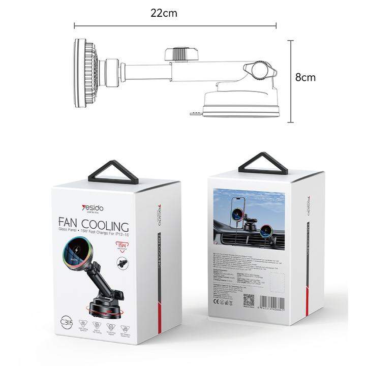 Experience fast, stable, and cool charging with the Yesido C315 15W Fan Cooling Wireless Car Charger. Engineered with a built-in cooling fan, it effectively prevents overheating during charging, ensuring your phone stays safe and fully powered. The magnetic glass panel provides a secure grip for your device, while 15W fast wireless charging supports all Qi-enabled smartphones, including iPhone 12–16 series. With its extendable 22cm arm and 360° rotation, you can easily adjust the position for both dashboard and air vent setups — perfect for navigation or hands-free calls.