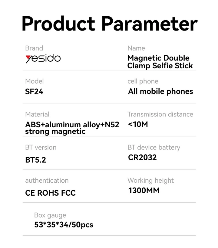 The Yesido SF24 is a multifunctional premium selfie stick and tripod engineered for creators who value versatility, durability, and mobility. Crafted from aluminum alloy and ABS, it provides outstanding strength while remaining lightweight and portable for daily shooting or travel.