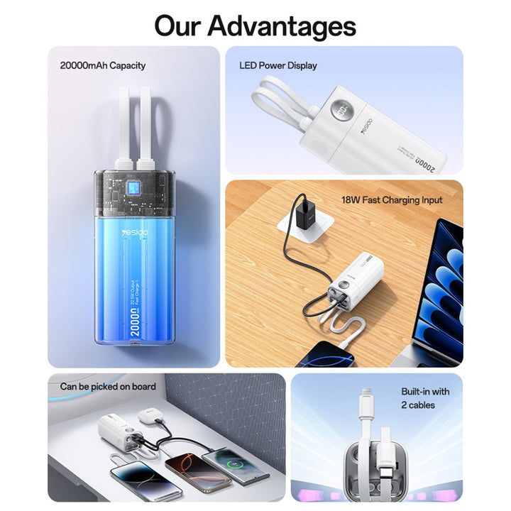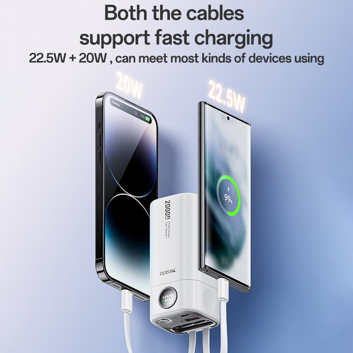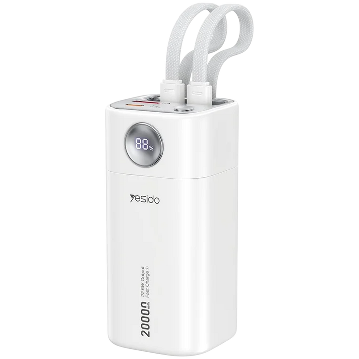 The Yesido YP86 20000mAh Power Bank is designed for power on the go, combining high capacity with smart convenience. Equipped with dual built-in cables (USB-C & Lightning), you no longer need to carry extra cords. With 22.5W fast charging output, it ensures quick and efficient charging for your smartphones, tablets, and other devices.