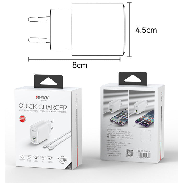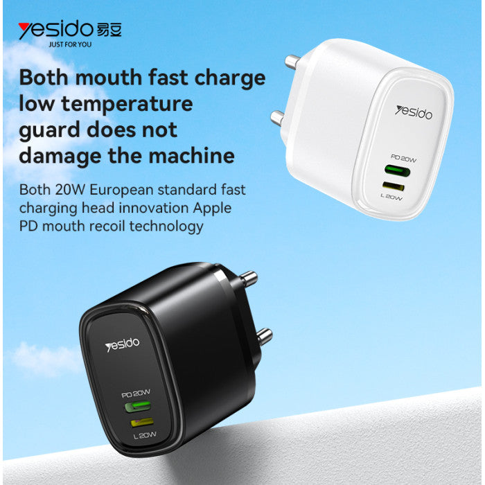 Experience fast, efficient, and reliable charging with the Yesido YC44 20W Quick Charger — the perfect companion for your daily power needs. Designed with dual USB-A and Type-C ports, it allows you to charge two devices simultaneously at high speed. Built with a fire-retardant PC shell, the charger offers superior safety and heat resistance. It supports major fast-charging protocols like QC, PD, PPS, and SCP, ensuring compatibility with most smartphones and tablets. The compact 8 cm × 4.5 cm design makes it perfect for home, office, or travel use.