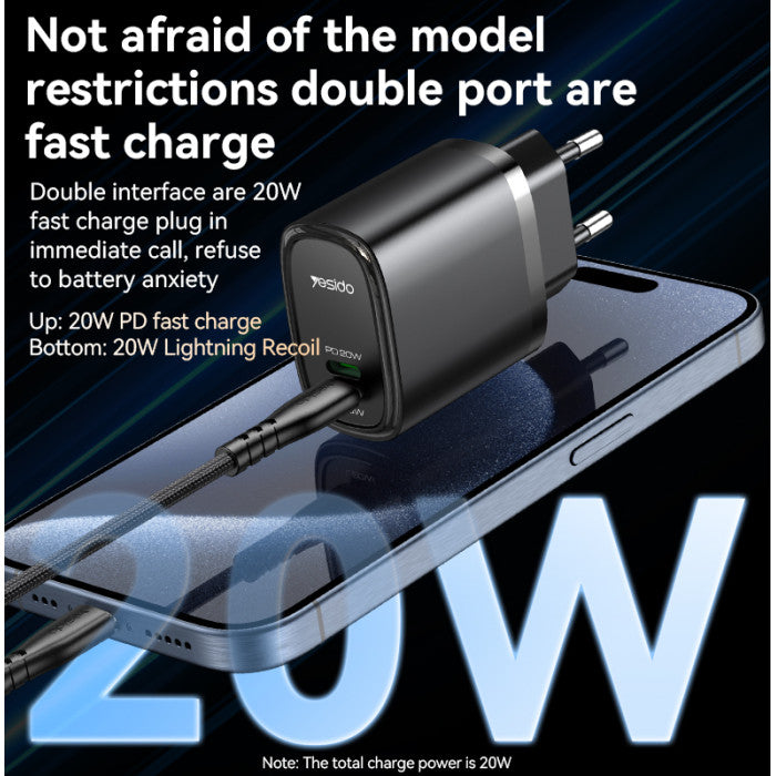 استمتع بشحن سريع وفعّال مع Yesido YC44 20W Quick Charger — الشاحن المثالي لتلبية احتياجاتك اليومية من الطاقة. يتميز بمنفذين USB-A وType-C يتيحان شحن جهازين في نفس الوقت بسرعة عالية. مصنوع من خامة PC مقاومة للحريق لتوفير أمان وحماية ممتازة ضد الحرارة. يدعم بروتوكولات الشحن السريع QC، PD، PPS، SCP لضمان توافق واسع مع معظم الهواتف الذكية والأجهزة اللوحية. تصميمه المدمج بحجم 8 × 4.5 سم يجعله مثاليًا للاستخدام في المنزل أو المكتب أو أثناء السفر.