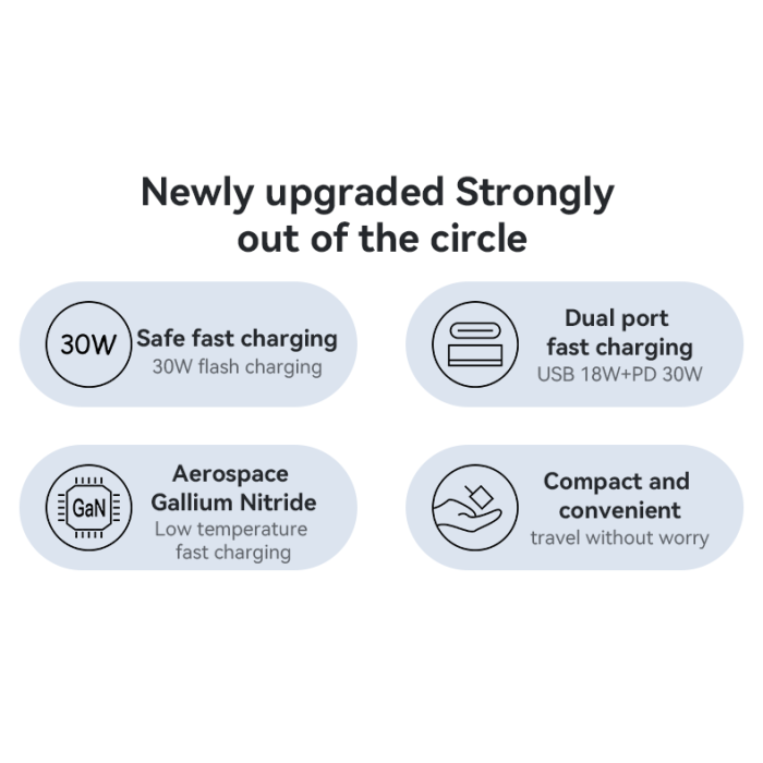 - ⚡ شحن سريع GaN بقدرة 30W – يقدّم طاقة فعّالة بسرعة وثبات عالي.
