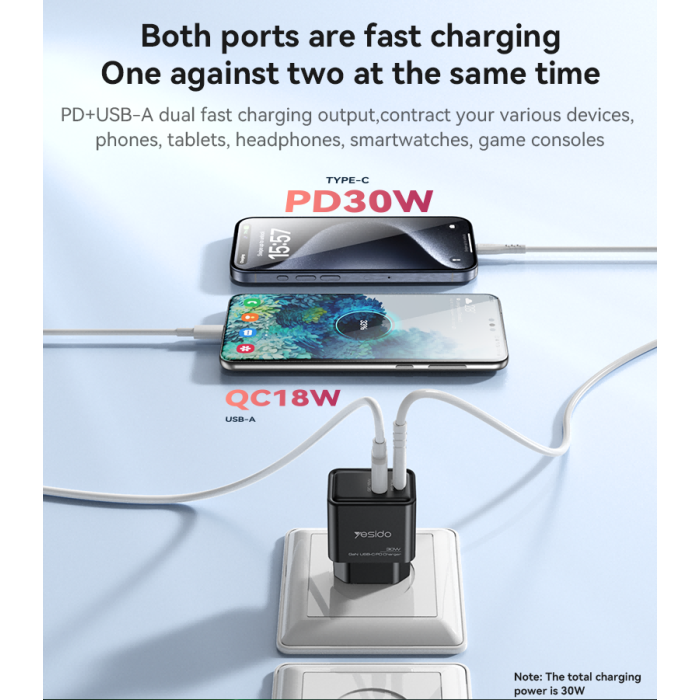 استمتع بشحن سريع وفعّال مع Yesido YC64 30W GaN Charger المزود بتقنية Gallium Nitride (GaN) المتقدمة،