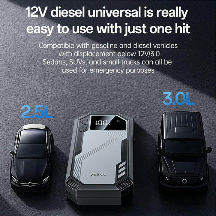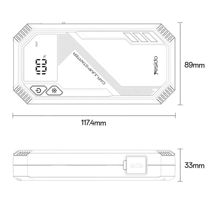 Yesido 800A Car Jump Starter هو جهاز قوي ومحمول متعدد الاستخدامات بيخليك دايمًا جاهز للطوارئ على الطريق. مصمم للسيارات، الدراجات، والـSUV، وبيجمع بين بطارية بسعة 6000mAh، تيار ذروة 800A، وكشاف طوارئ LED لتجربة آمنة وموثوقة في أي وقت.
