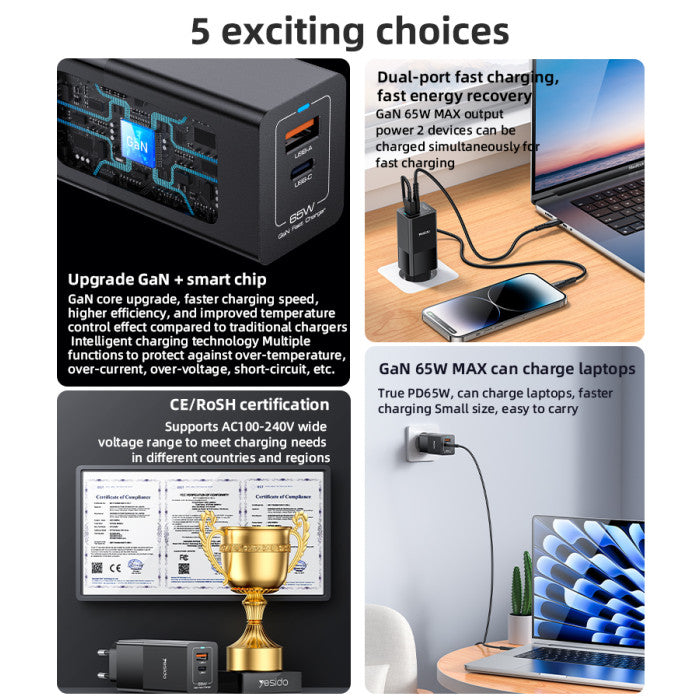 Compatible with PD65W & QC18W protocols, this charger supports a wide range of devices including MacBooks, iPads, and Android phones.