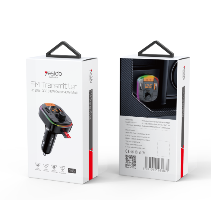 Experience seamless in-car charging and entertainment with the Yesido Y45 Bluetooth FM Transmitter Car Charger. Designed for modern drivers, this multifunctional car adapter combines fast charging with high-quality wireless audio transmission. Equipped with dual USB ports — one PD 20W and one USB 3.0 — it allows you to charge two devices simultaneously while maintaining maximum speed and safety. The built-in Bluetooth to FM converter lets you play music, answer calls, and even read U-disks or Micro SD cards effortlessly. Crafted from durable materials and featuring a bright LED indicator, the Y45 ensures convenience during both day and night drives. With smart chip protection, your devices stay safe from overcurrent, overheating, and short circuits.