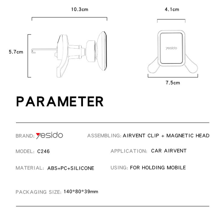 يوفر Yesido C247 حامل الموبايل لمخرج التكييف تثبيتًا موثوقًا وآمنًا أثناء القيادة. مصنوع من ABS + PC + سبيكة ألمنيوم لجودة تصنيع متينة ومظهر أنيق.