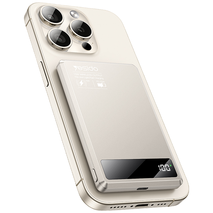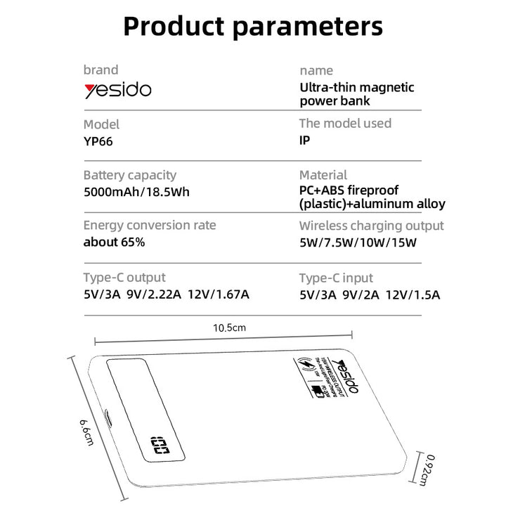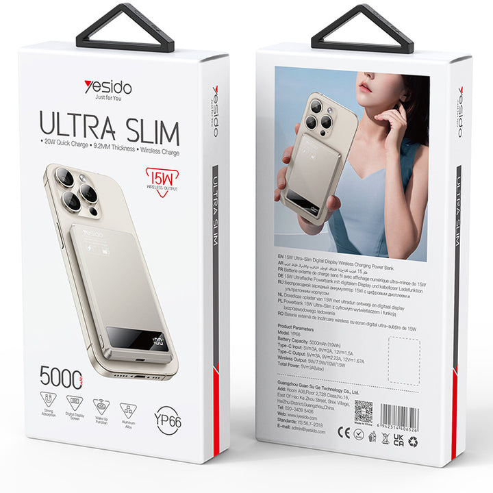خلي أجهزتك مشحونة في أي مكان مع Yesido YP66 Ultra Slim Power Bank. بسعة 5000mAh، باور بانك مدمج وخفيف بيجمع بين شحن سلكي سريع 20W وشحن لاسلكي 15W علشان يوفرلك أقصى راحة. جسمه فائق النحافة بسمك 9.2mm مصنوع من الألومنيوم، وبيخليه سهل الحمل في جيبك أو شنطتك من غير وزن أو حجم زيادة.